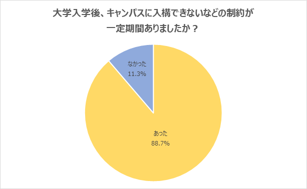 (1)「大学入学後、キャンパスに入構できないなどの制約が一定期間あった」と回答した学生が9割に迫る