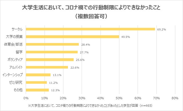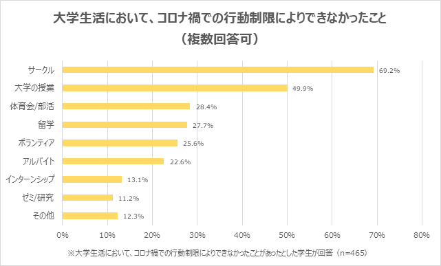 「コロナ禍の行動制限で、学生生活で実現したかったのにできなかったことがある」の回答が9割に迫る。できなかったことは「サークル」が最多/2024年卒対象アンケート