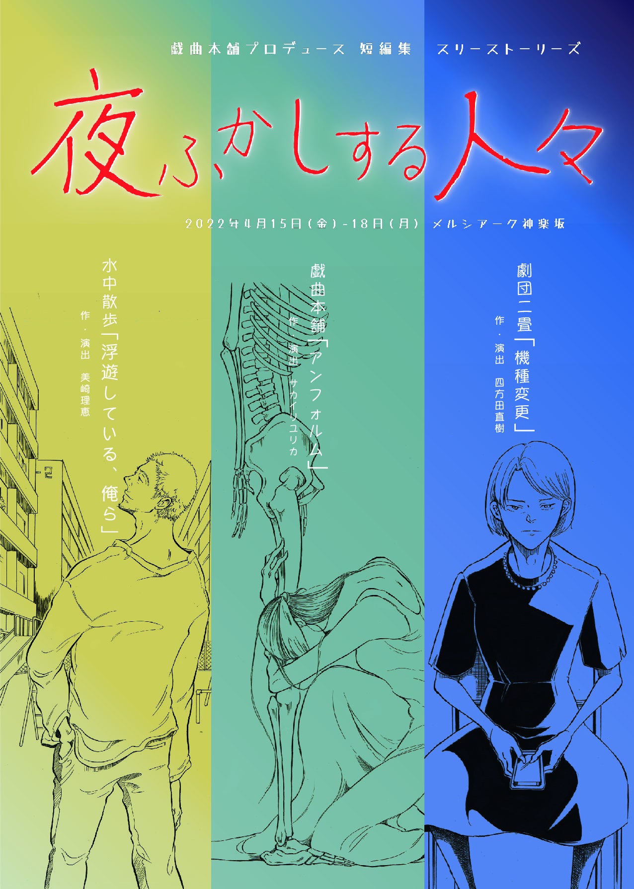 「夜ふかしする人々」を共通モチーフに描く、3つの短編作品(30分以内)のオムニバス公演。