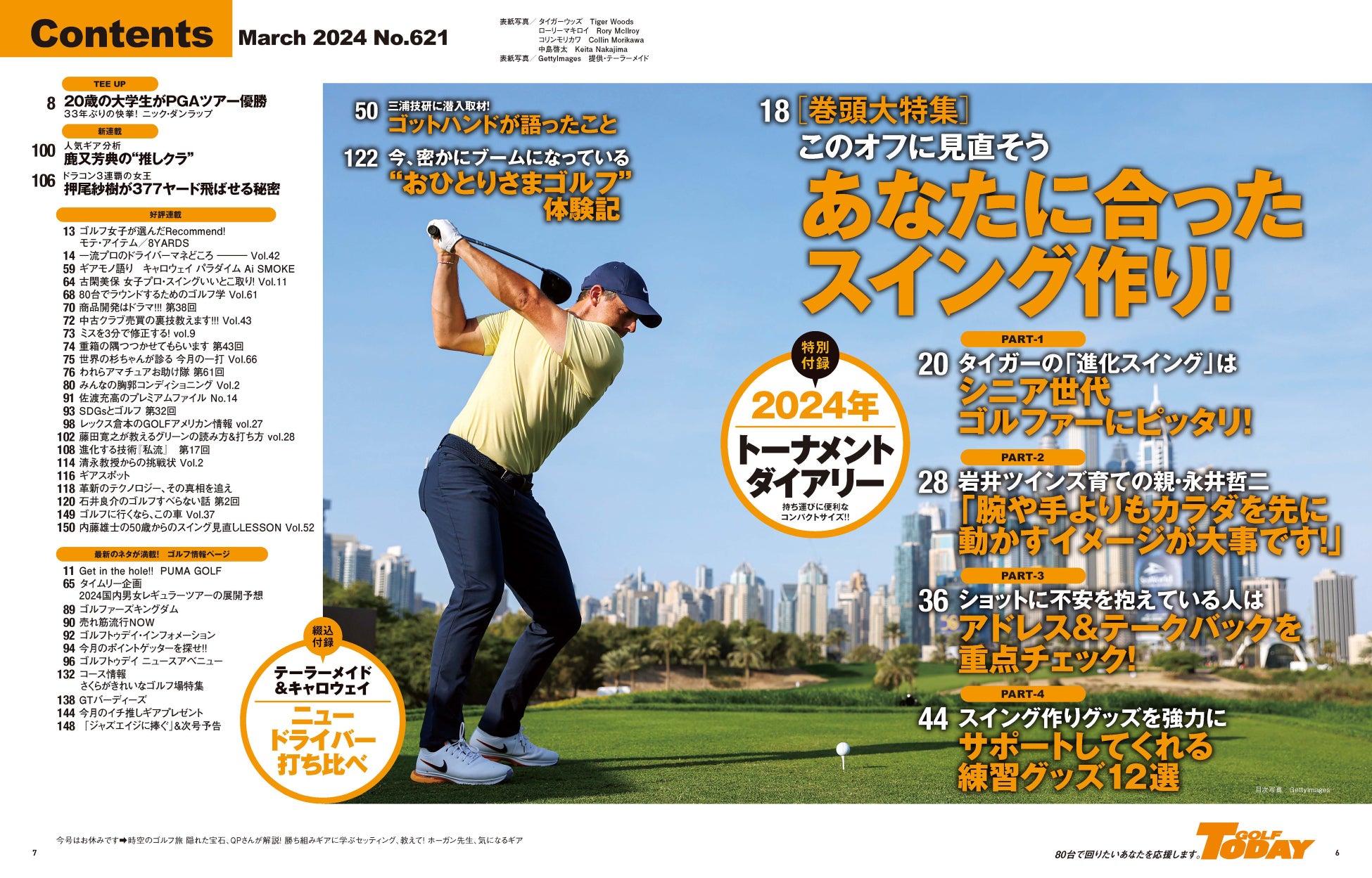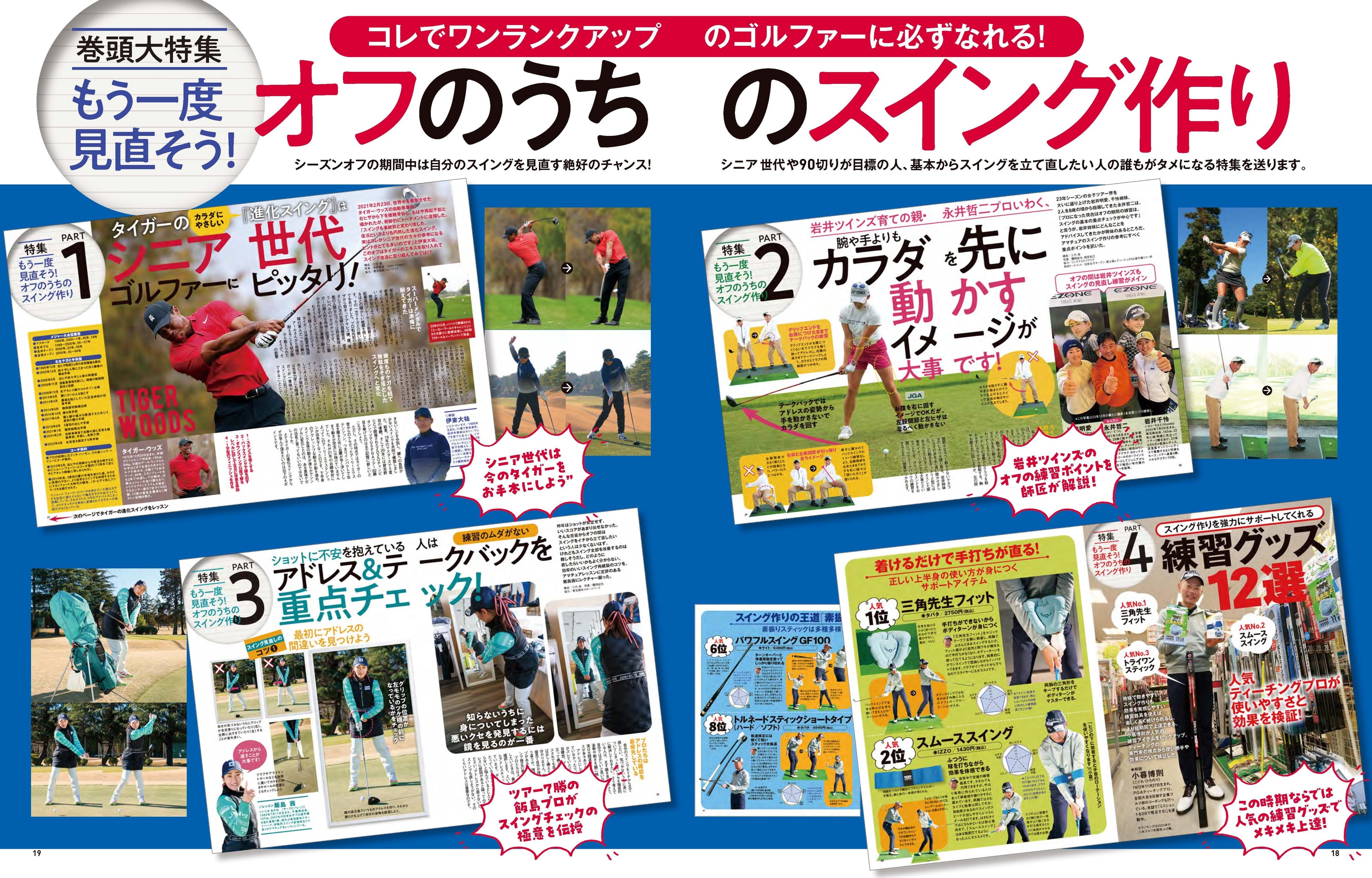 巻頭特集のテーマは「このオフに見直そう あなたに合ったスイング作り!」その中でも目玉はPART1のタイガーの「進化スイング」はシニア世代ゴルファーにピッタリという久々にタイガー・ウッズをフューチャーした企画。シニア世代に馴染みのあるタイガーは、大きなケガや手術を重ねたことによって、カラダの稼動域が狭くなったり、柔軟性が損なわれてきたなかでも新しいスイングで復活してきた。その最新のスイングがとても参考になるという注目の特集です。他にも岩井ツインズを育てた永井哲二プロのレッスンや、飯島茜プロにより鏡を使ったスイングチェックなど、読み応えのある誌面展開になっています。