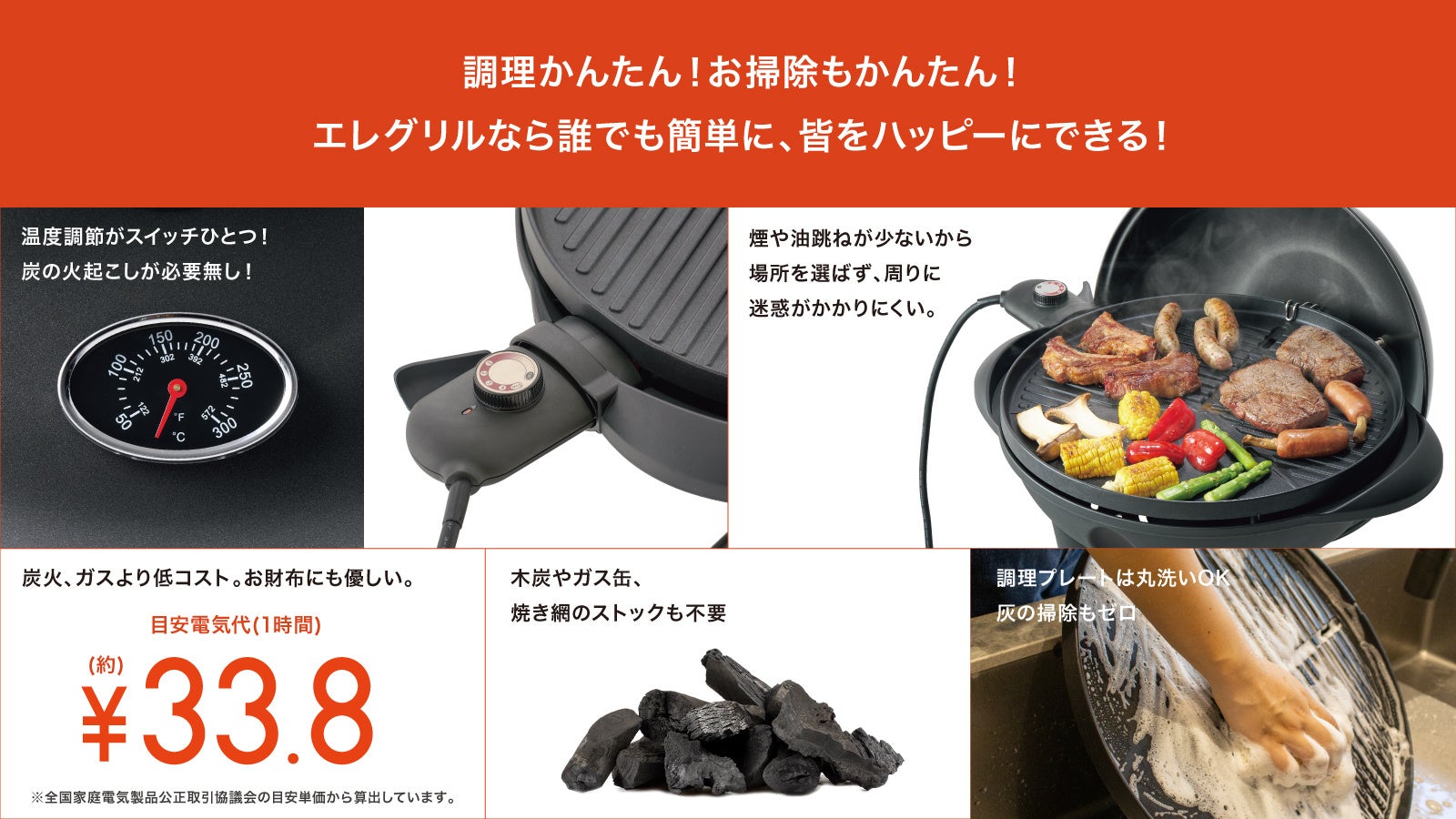 コンセントにつないでスイッチ1つで手軽にBBQができる電気式グリル。炭火ではないため煙や油跳ねが少なく、ベランダなどの屋外はもちろん屋内でも使用可能。炭火では難しい温度調整も可能なため、食材を焦がすことなく美味しく調理できる。電気代は1時間当たり約33.8円と、木炭を燃料とするBBQグリルやガスボンベ式調理器具より低コスト。グリルプレートと上蓋は外して丸洗いができ、お手入れも簡単。