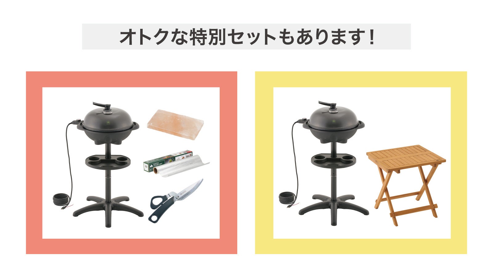 BBQをさらに快適に楽しめるシザーナイフや焼きそばシート、岩塩プレートがセットになった「BBQレパートリー充実セット」のほか、使い勝手の良いユーカリ材のテーブルが付いた「サイドテーブルセット」など、Makuakeだけのお得なセットも数量限定でご用意しております。
