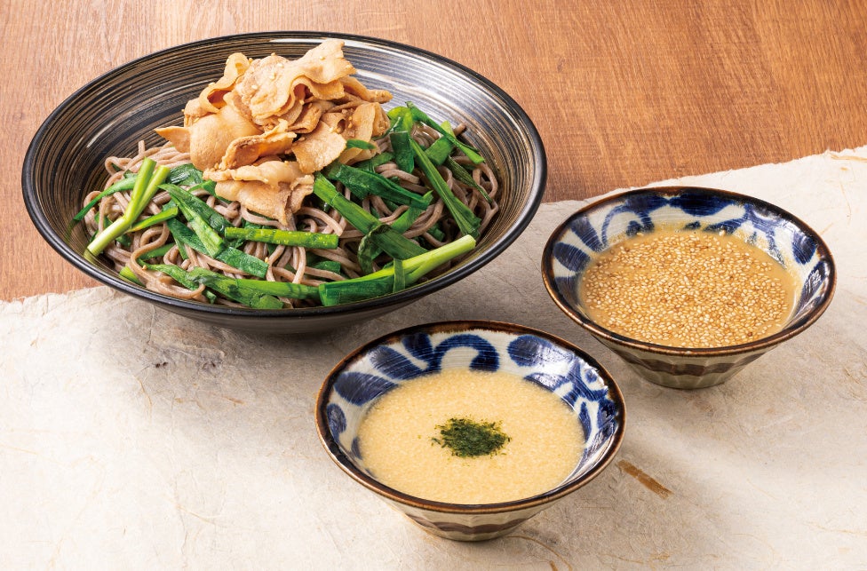 残暑の厳しさを、そばののどこしで乗り切る!1度で2種類楽しめる期間限定メニュー「~2種のつけだれ~豚しゃぶニラつけそば」を2024年8月28日(水)より「東京とろろそば」全店で販売を開始いたします。