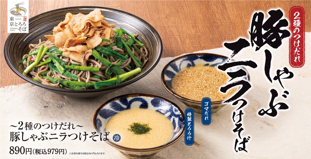 アークランドサービスホールディングス株式会社の子会社、「肉めし岡もと」などを運営する株式会社トビラダイニング(本社:東京都千代田区/代表:大内 勇一)は、とろろそば専門店「東京とろろそば」全店にて、1度で2種類楽しめる「~2種のつけだれ~豚しゃぶニラつけそば」を2024年8月28日(水)より期間限定で販売開始いたします。