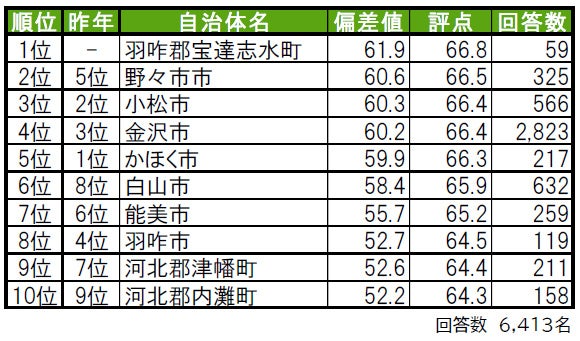 1位は羽咋郡宝達志水町で、昨年は累計回答数が50名未満でランキング集計対象外だった街です。2位は野々市市で、「住みここち」「住み続けたい街」「街に愛着がある」1位、「住みたい街」「街に誇りがある」2位と全てのランキングでトップ2に入っています。3位は小松市で、「街に愛着がある」でも3位、「住みここち」「住み続けたい街」5位となっています。