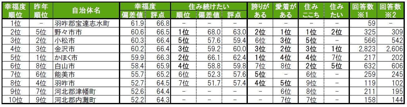 街の幸福度は、1位羽咋郡宝達志水町、2位野々市市、3位小松市。