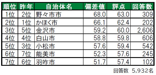 住み続けたい街は、1位野々市市、2位かほく市、3位金沢市。