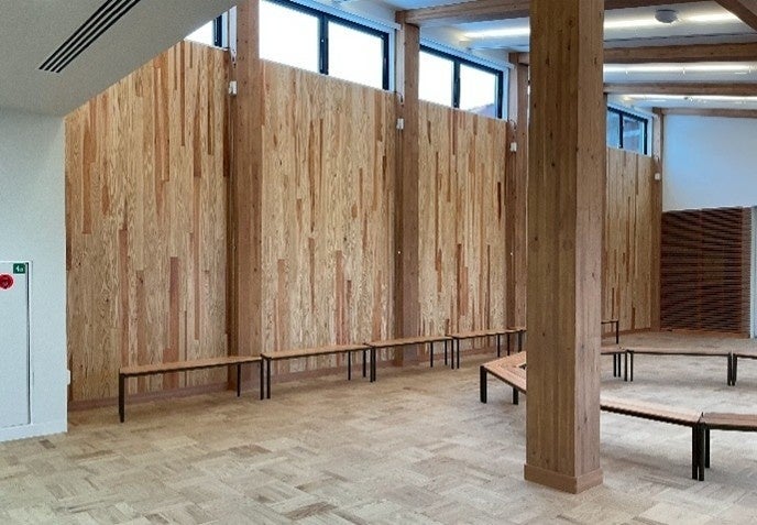 本校舎では、床材・壁材の一部、下足入れ、交流ホールベンチなどに地元・福島県産木材を約16m³使用しています。地域材の活用は、林業振興や森林資源の循環利用といった地域経済への寄与に加え、児童・生徒が地域の資源に触れながら学べる教育環境の形成にもつながります。この県産材の利活用は、森林環境の保全、および森林を全ての県民で守り育てるという「福島県森林環境税」の目的に沿った取り組みとなっており、これを財源とした福島市森林環境交付金事業補助金(※7)の交付を受けております。地産地消による木材活用を通じて、地域に根ざした学びの場づくりを支援しています。