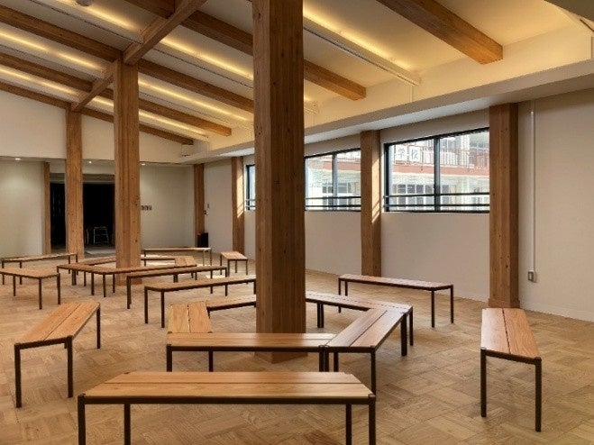 木造建築には、炭素の固定による脱炭素への貢献(本施設の木材使用量は371㎥、炭素貯蔵量は294t-CO2※5、スギの木(50年生)は583本分(※6))の他、木の空間による心理面や学習面などへの好影響や、ウェルビーイングの向上も期待されています。教育施設での活用も親和性が高いと期待されるなか、桜の聖母学院の事例は教育施設における木造化の新たな可能性を示しています。