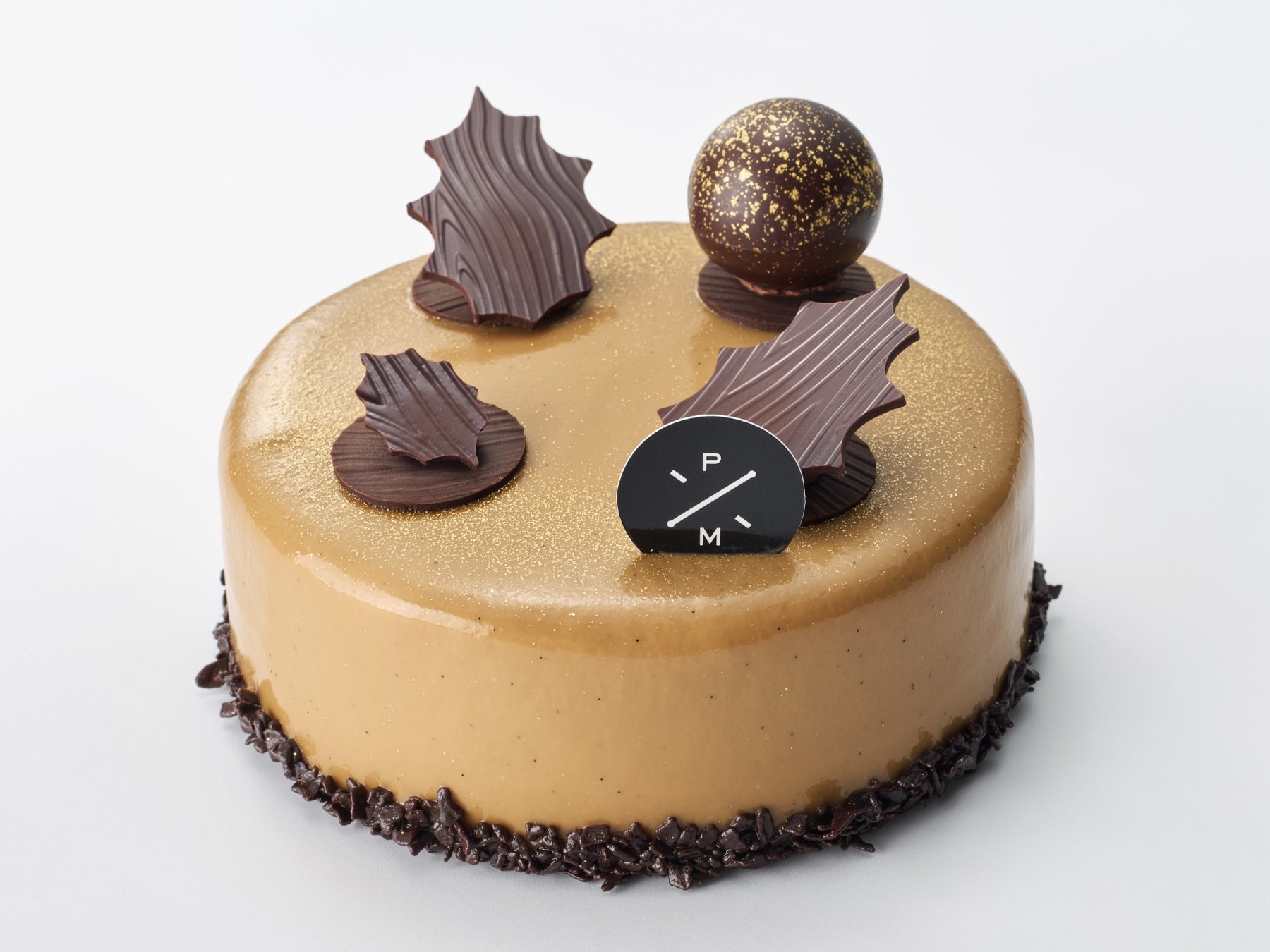 口どけ滑らかなババロワキャラメルと濃厚なクレムーキャラメルを重ねて仕立てたクリスマス限定のキャラメルケーキ。テクスチャーの異なる2層が織り成す深いキャラメルの味わいに、香ばしいヘーゼルナッツの風味とサクサクとした歯応えがバランスよく調和しています。艶やかなグラサージュの上には、オリジナルビターチョコレートで作ったボールとヒイラギを飾りました。