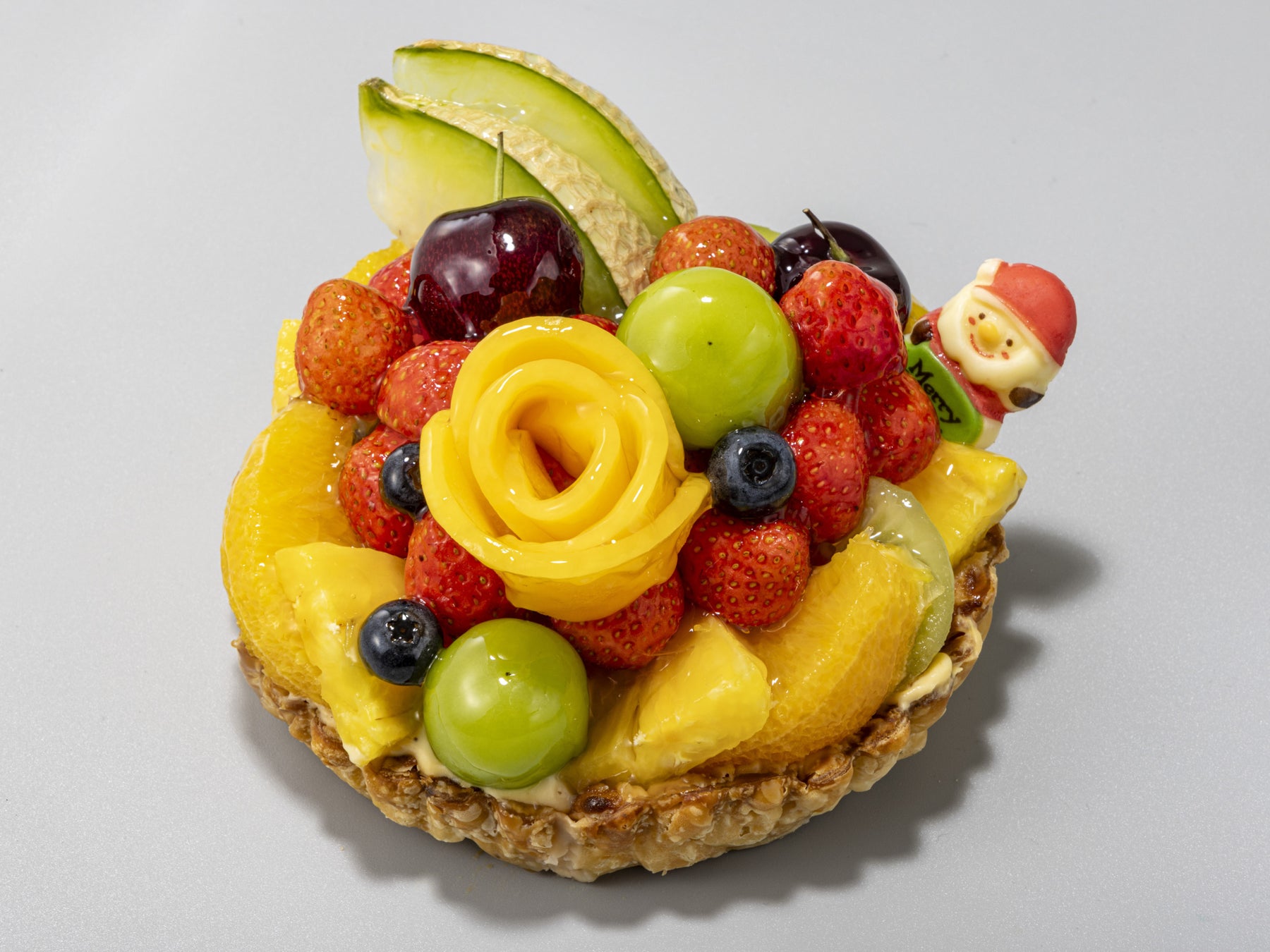 少人数のパーティーにもぴったりな13cmサイズのフルーツタルト。中央にはマンゴーのバラを飾り、いちごやシャインマスカット、ダークチェリーなど10種のフルーツをふんだんに使用しています。フルーツ大好きな方へおすすめのタルトです。