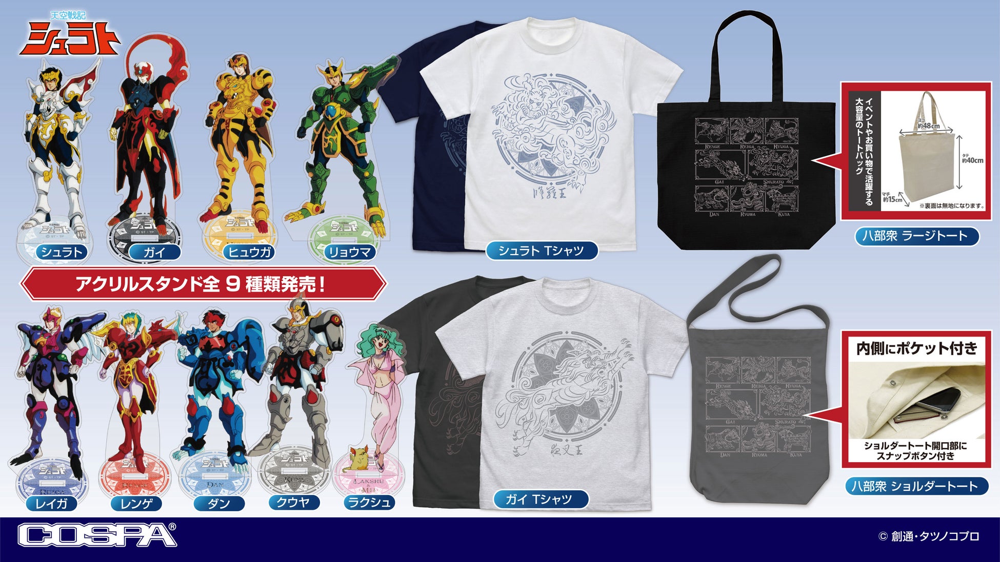 1989年の放送開始から35周年を迎えた『天空戦記シュラト』より、修羅王シュラトや夜叉王ガイをイメージした「Tシャツ」をはじめ、八部衆「ラージトート」、「アクリルスタンド(9種)」がCOSPA(コスパ)から登場です。