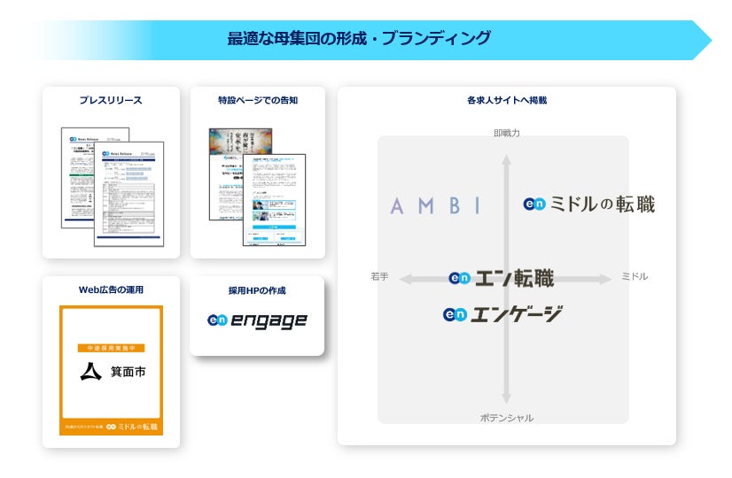 プレスリリースや特設ページ、Web広告での告知に加え、各求人サイトでの集客支援を実施。『エン転職』『エンゲージ』『AMBI』『ミドルの転職』とターゲットの異なる求人サイトを活用することで、ターゲットへ網羅的に求人を届けます。