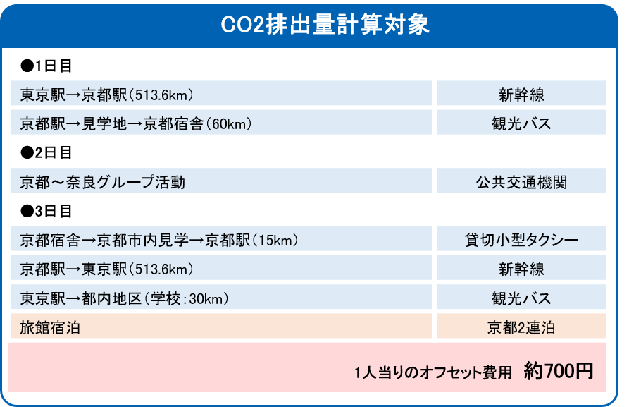 | <カーボンオフセットの内容・費用例> 東京都下、某中学校生徒100名の京都までの修学旅行の場合(※3) ・目的地までの移動+現地全体移動+宿泊 ¥700 ・目的地までの移動+現地全体移動 ¥400 ・目的地までの移動のみ ¥250 |