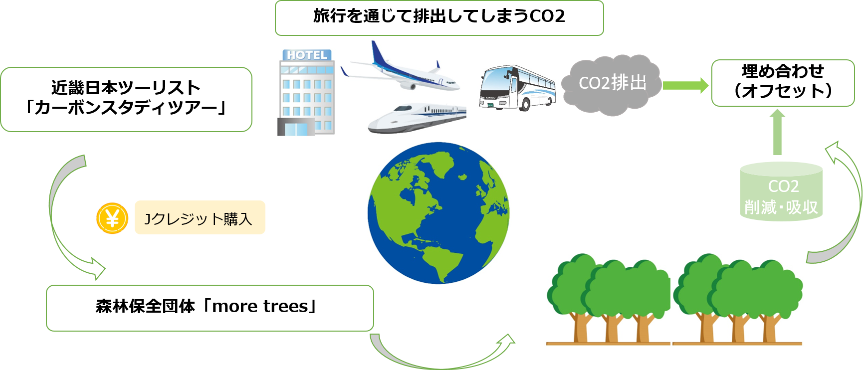 当社では、一般社団法人more trees(※1)が提供するJ-クレジット制度(※2)により認証された森林由来のカーボンクレジットを活用し、旅行行程における温室効果ガス排出分をオフセット(CO2排出を打ち消し)します。