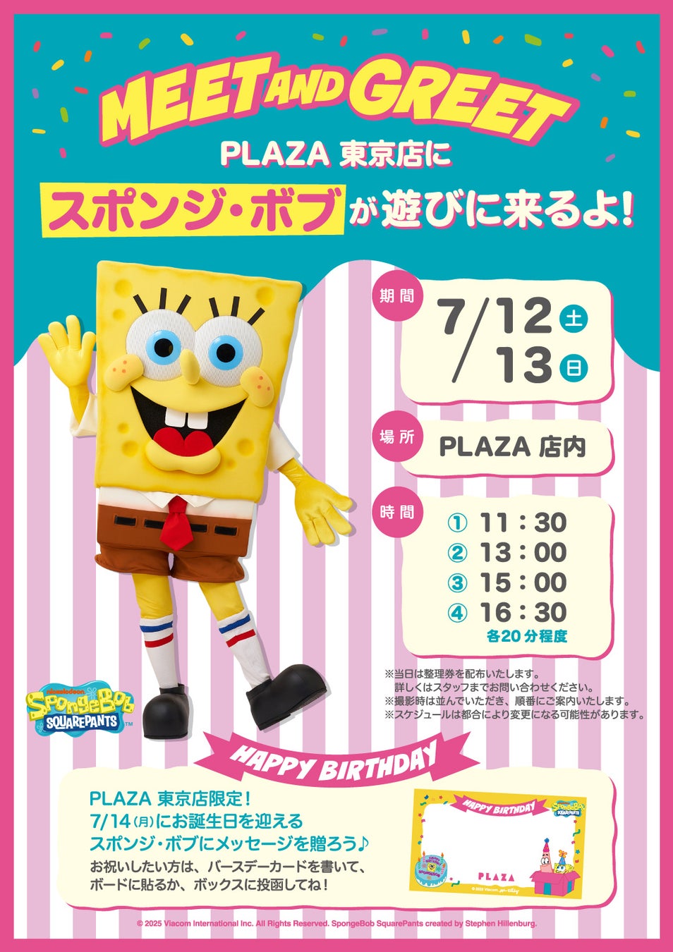 スポンジ・ボブがPLAZA 東京店に遊びに来る「Meet & Greet」を実施!スポンジ・ボブと一緒に写真をお撮りいただけます。スポンジ・ボブに直接お祝いのメッセージを伝えよう!