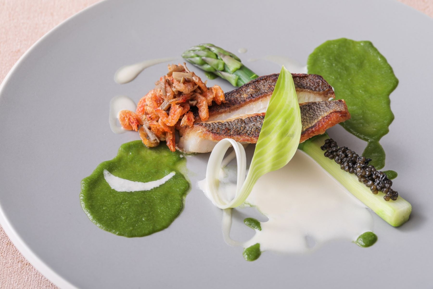 メバルのポワレ キャビアと桜海老のコンディメント ヴェルモットとセリのソース