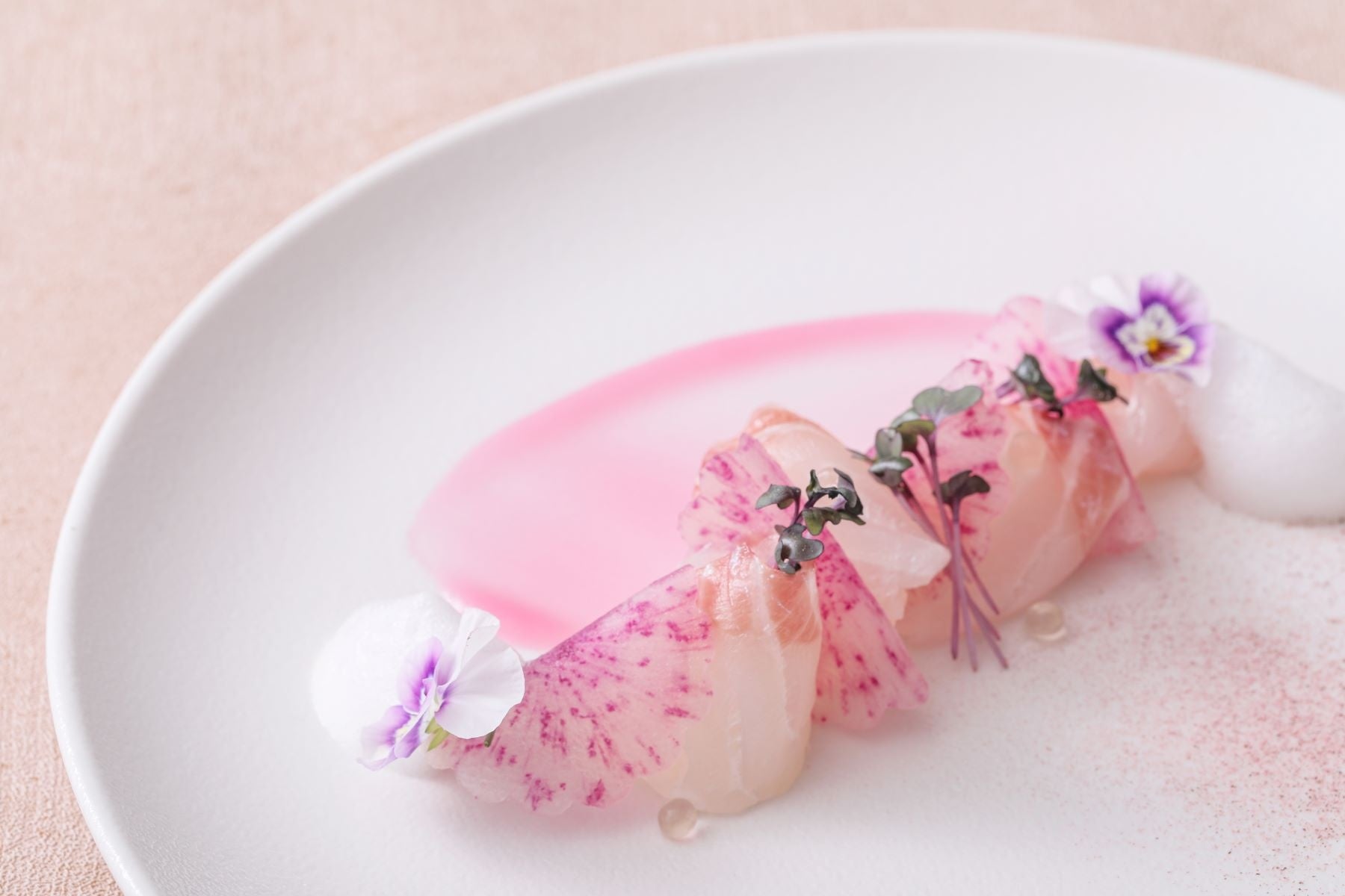 桜鯛のカルパッチョと紅しぐれ大根のマリネ カブのピュレとピンクバルサミコ 昆布エキスのヌーベ