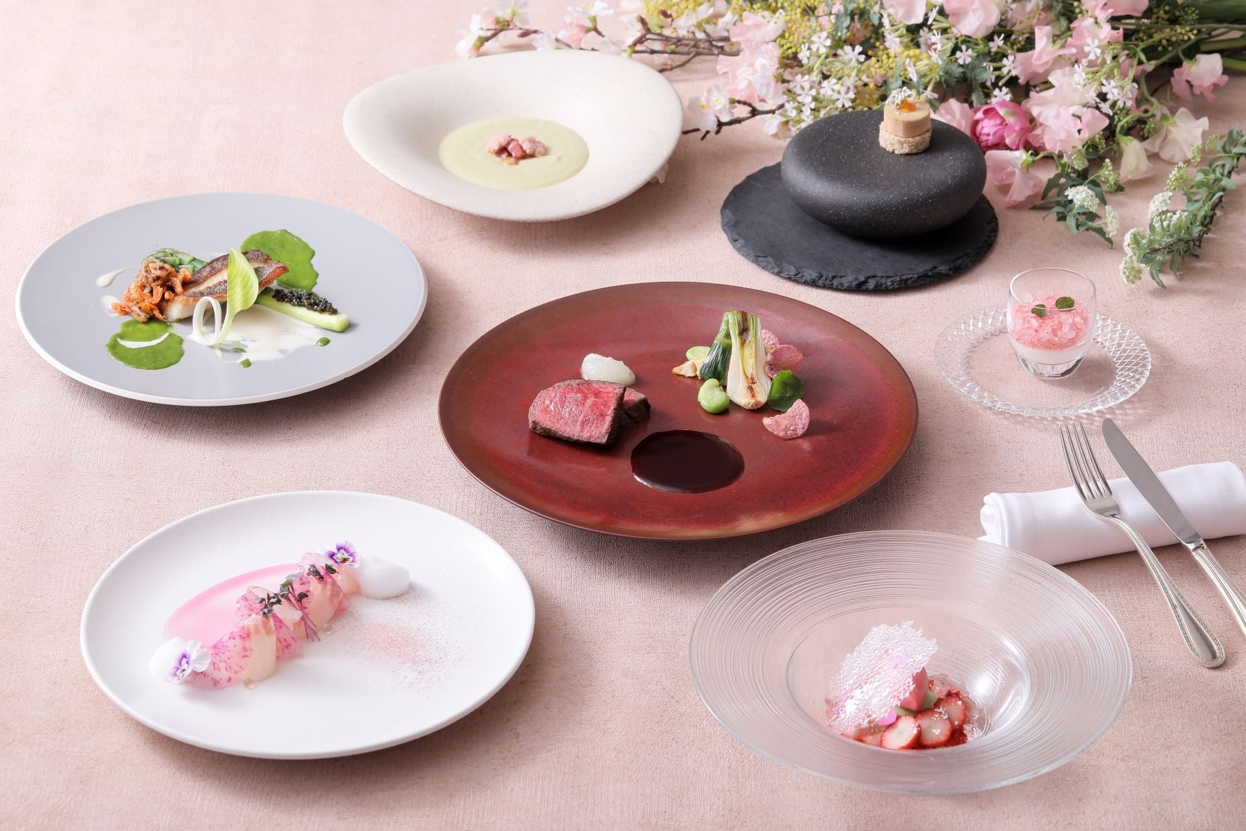「今お召し上がりいただきたい、季節ならではの美味しいものを」をコンセプトとし、今回は桜鯛やメバル、彩豊かな春野菜などの食材をオンメニュー。また、地元愛知県の食材も多数取り入れ、生産量が限られ希少価値のある蒲郡産のデコポンを使用したフォアグラのテリーヌや、甘みのある愛知県産の春キャベツのスープ、やわらかな肉質と程よい甘さの脂肪バランスがよい知多牛「誉」のロティ、ジューシーで甘さと酸味のバランスが 絶妙な愛知県産「ゆめのか」を使用した春色のスイーツなどをお楽しみいただけます。