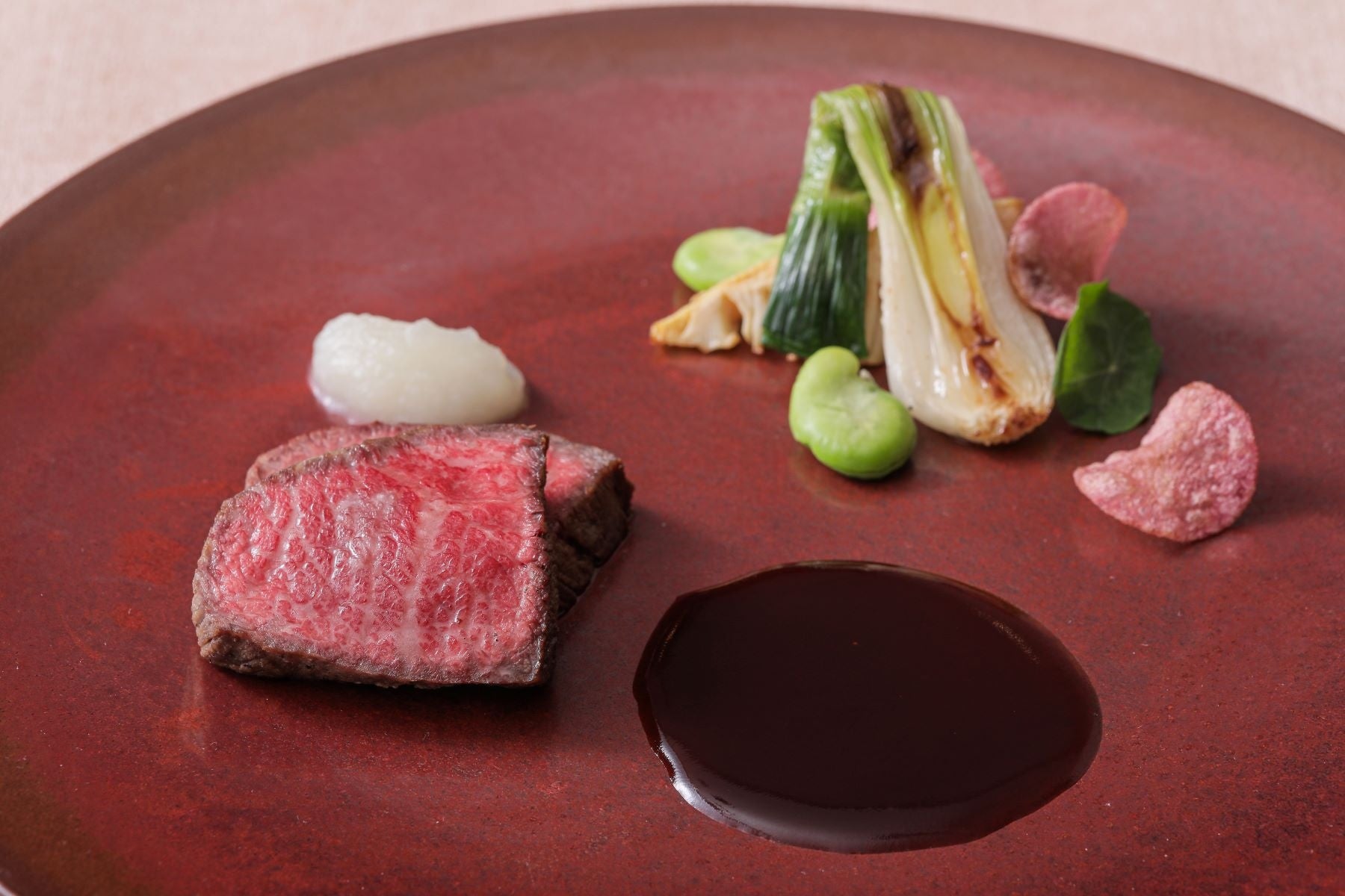 知多和牛「誉」のロティと春野菜 新玉葱のピュレと赤ワインのソースで