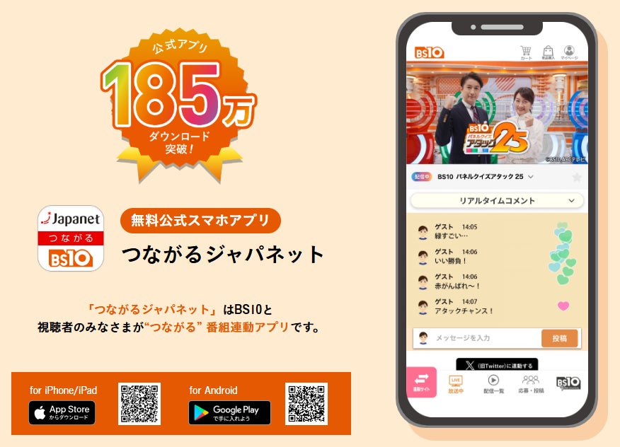 公式アプリ「つながるジャパネット」(無料)、コネクテッドTVサービス(無料)での同時配信あり