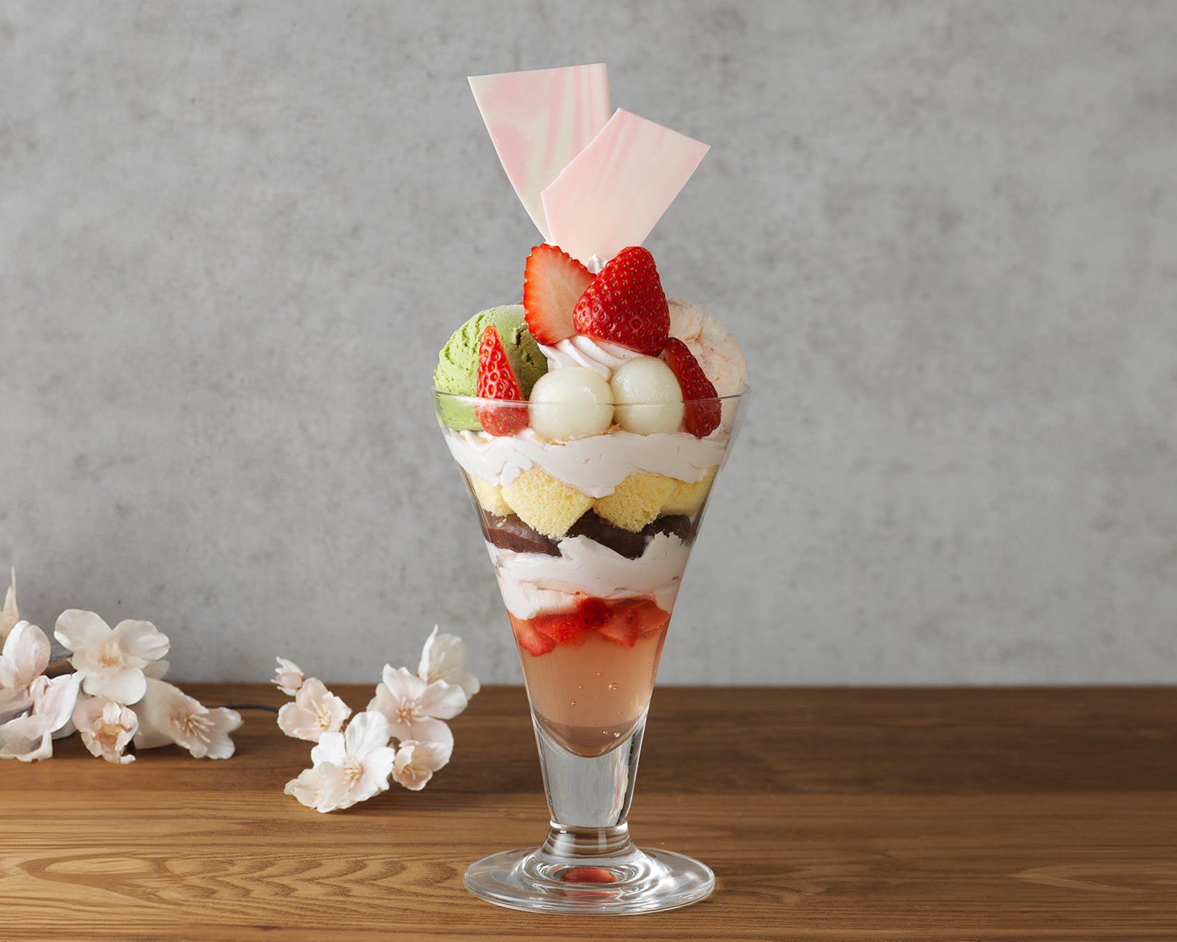さわやかな味わいの桜ジュレに、苺ダイス、桜のミルクプリン、優しい甘さの粒あんを重ね、軽やかな桜シャンティを絞りました。もっちり食感の白玉をトッピングし、ほろ苦い抹茶アイスと華やかな甘みのある桜アイスを飾った、見た目も味わいも贅沢な一品です。