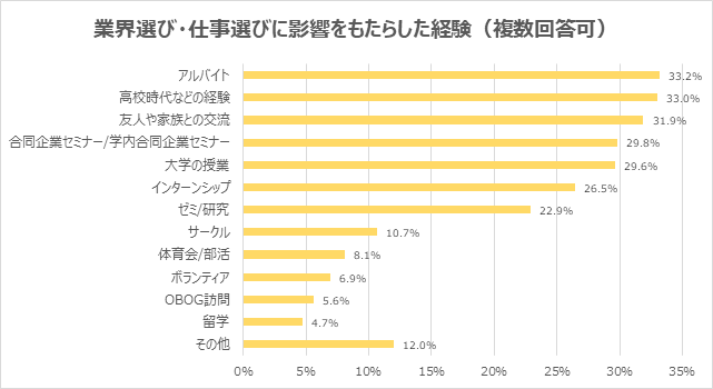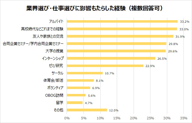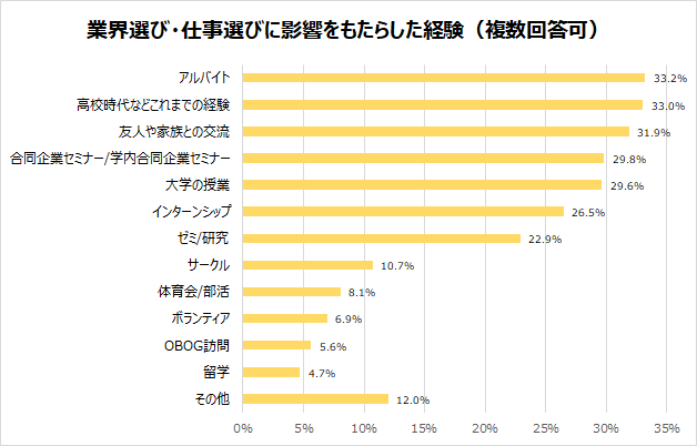 (2)業界・仕事選びに影響をもたらした経験は「高校時代などの経験」が、「アルバイト」に次いで2位に