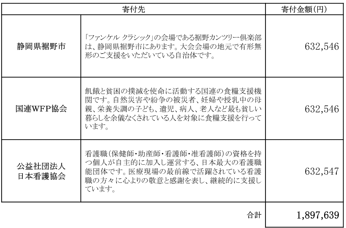 株式会社ファンケルは、2022年8月19日(金)~21日(日)に開催したPGAシニアツアー「ファンケル クラシック」(公益社団法人 日本プロゴルフ協会※主管競技)にて行ったチャリティ活動で集まった総額1,897,639円を、『ファンケル クラシック基金』を通じて「静岡県裾野市」と「国連WFP協会」、「日本看護協会」の3団体に寄付いたしました。