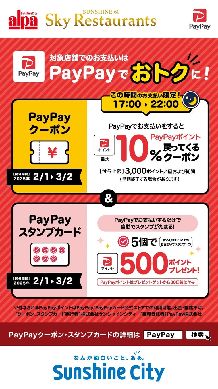 PayPayと連携した2つの企画を同時開催しました。税込1,000円以上の決済でスタンプが獲得でき、5スタンプ貯まると500pt獲得できるスタンプ企画と、17時以降の決済で決済額の10%がポイントとして還元される企画を実施。客単価や買い回り率の増加、夜帯の盛り上がりに繋がりました。