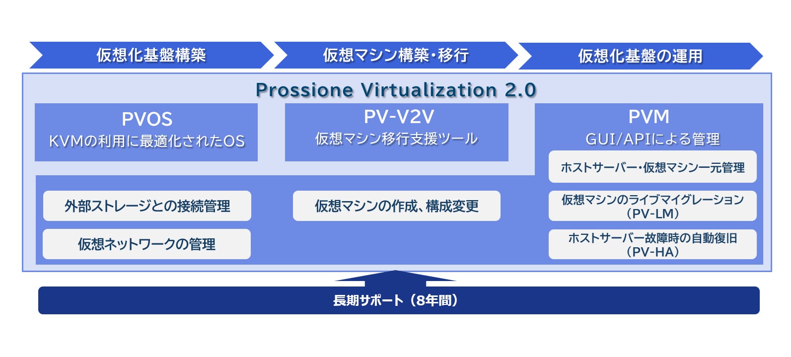 「Prossione Virtualization 2.0」は、仮想化基盤の新規構築から運用までの一連の管理作業をGUIで一元的に実行可能です。数十台規模の中小規模システムを対象に、仮想化基盤の構築から運用までを、一般的な技術レベルの担当者でも実行可能とする機能強化を実施。さらに、障害発生時でも業務停止を回避する高可用構成の導入や、他の仮想環境からの移行などの機能によりこれまで高度な専門知識や多くの工数を要していた設計・構築などの導入作業時間を削減します。また、仮想化基盤管理ソフトウェア「Prossione Virtualization Manager」の提供に加え、ナレッジ・ドキュメントの参照、専門技術者によるプロダクトサポート、トレーニングなどをサブスクリプション形式で提供。これにより、KVM導入・運用時に求められる高度な専門知識へのハードルを下げ、幅広いシステムへの適用を可能にします。