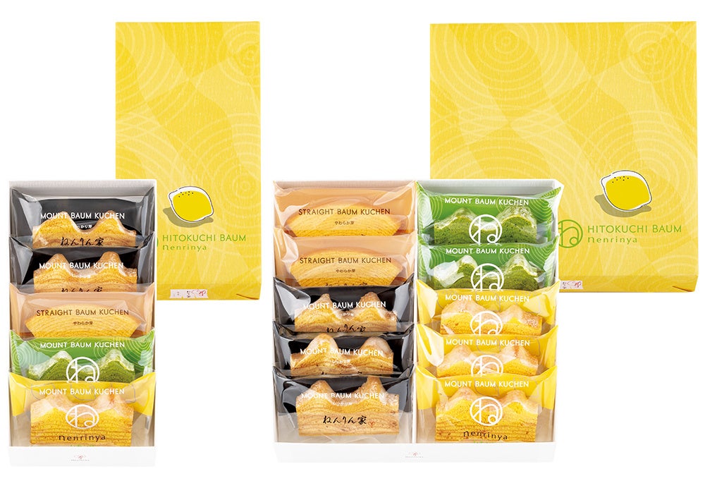 ねんりん家のバームクーヘンを 上品なひとくちサイズで⼀度に楽しめるセットです。バター⾵味たっぷりの代表作「ひとくちマウントバーム しっかり芽」。地中海レモンが爽やかな夏限定「レモン⾹るマウントバーム」。芳醇宇治抹茶⾹る「ひとくちマウントバーム お抹茶」たまごたっぷり「ひとくちストレートバーム やわらか芽」。