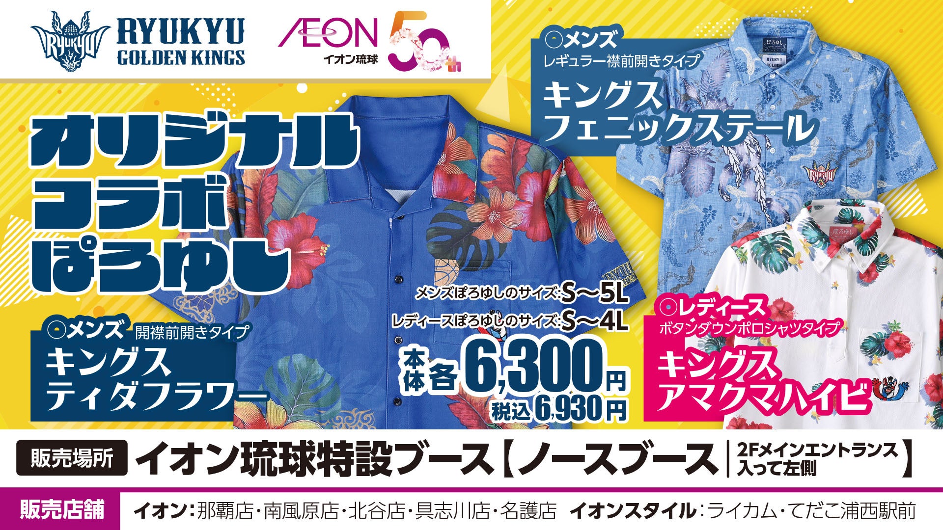 琉球ゴールデンキングスのトップオフィシャルパートナー イオン琉球株式会社では、キングスとコラボしたオリジナルデザインの「キングスぽろゆし2025年モデル」と「イオン琉球50周年記念 琉球ゴールデンキングス特製マグボトル」を4月19日(土)に開催される長崎ヴェルカ戦のイオン琉球冠試合にて、会場内2Fメインエントランス横の専用ブースで販売いたします。
