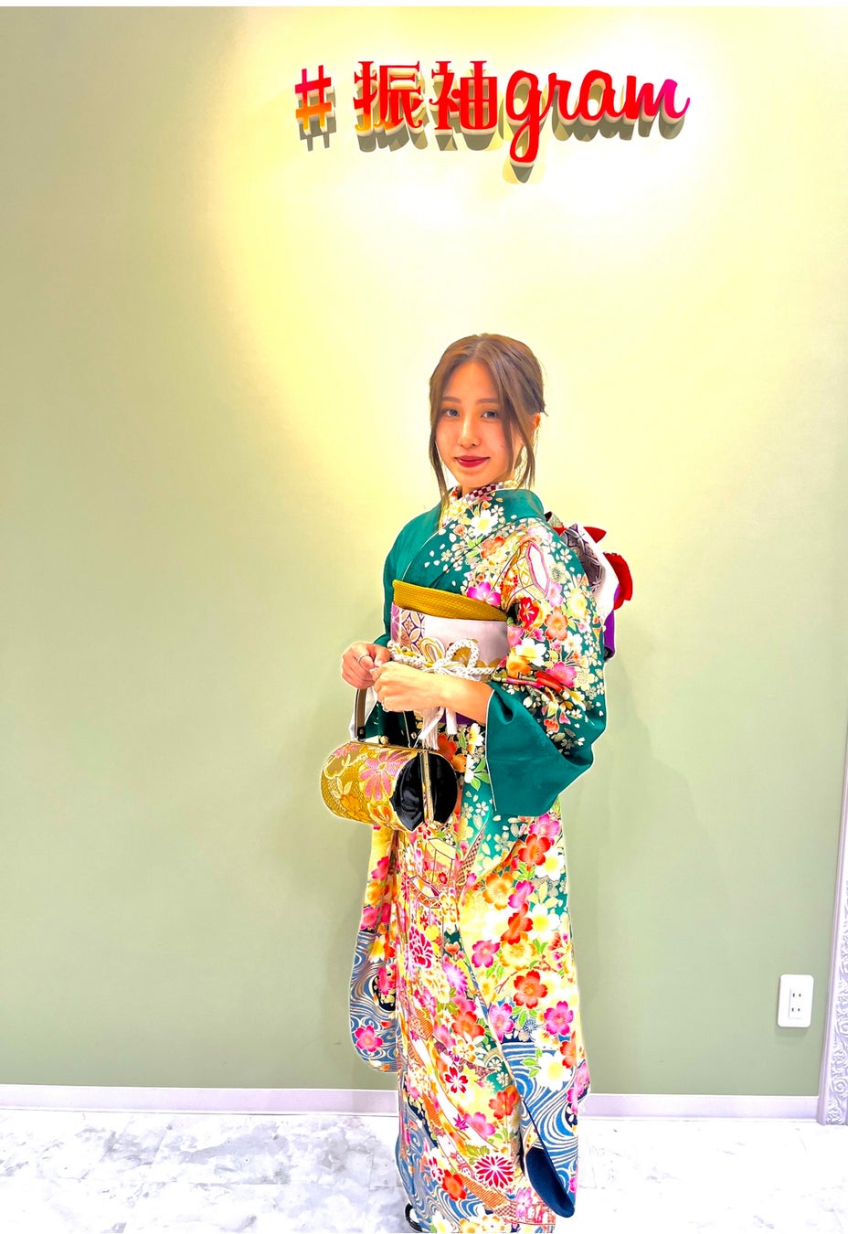 私自身振袖を着たのが初めてだったのもあって、まず襟や帯を選ぶのがすごく面白かったです!江戸時代からある日本古来の服装でもあるので、これほどまで華やかにしてくれる振袖を着る体験ができて嬉しかったです☺️✨ 綺麗なものが多くて悩みましたが、人生で着る機会があまりない中、私の大好きな緑の振袖を着ることができてとても光栄でした!!