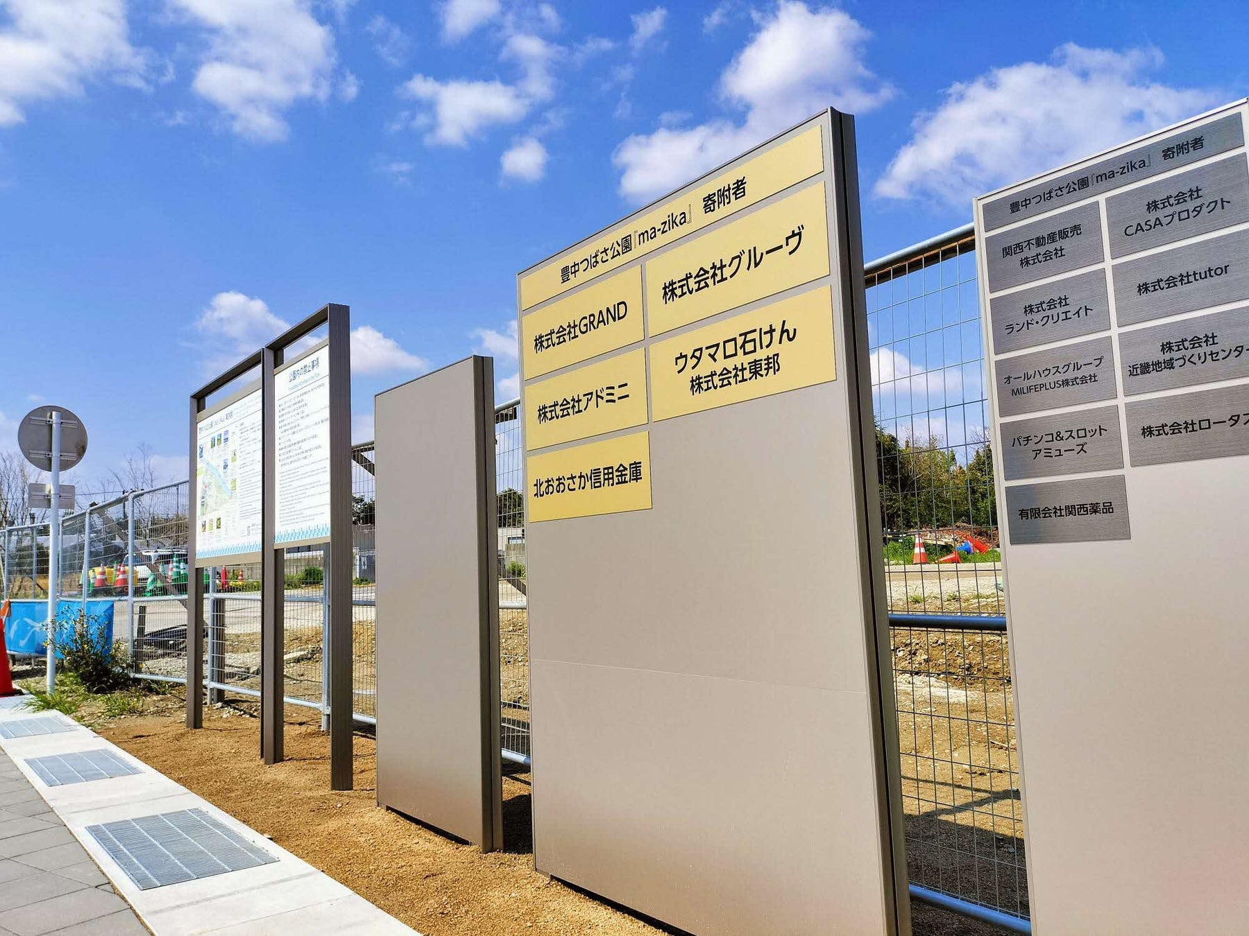 なお、管理事務所前メインエントランスにおいて、本公園の本体整備への企業版ふるさと納税による寄付に対するお礼として、寄付いただいた事業者の社名を記載する銘板を設置しています。引き続き本公園の整備に対して応援をいただける事業者を募集しています。