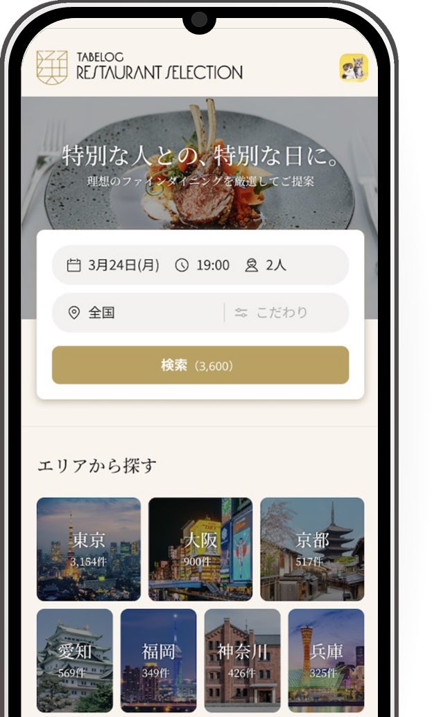 記念日、誕生日、会食などの「ハレの日」に着目したサービスです。食べログに掲載されている全国のレストランの中から、特別な人と過ごす、特別なひとときにぴったりのお店をご紹介します。ラグジュアリーなプライベート空間で食事が楽しめるお店、特別な日に喜ばれるサービスを提供しているレストランなど、さまざまな観点から設定した食べログ独自の基準により選出*しています。2025年3月24日(月)リリース。
