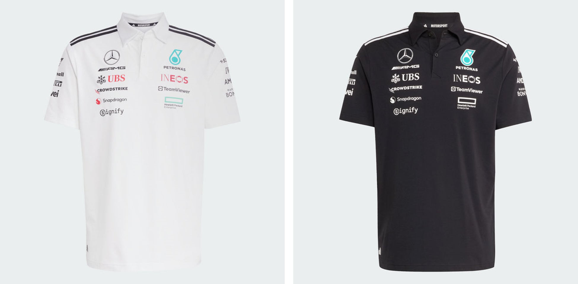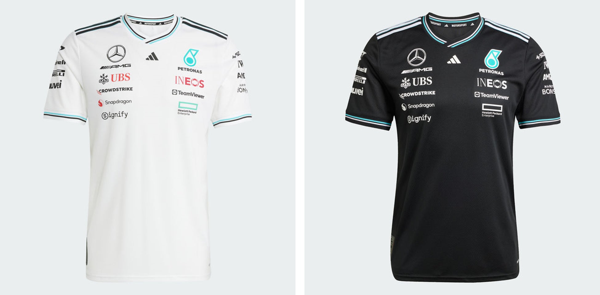 過去75年に渡って様々なスポーツにおいてトップアスリートを支えてきたアディダスの知見と経験とを活用し、スポーツとスポーツライフスタイルのデザインコードを再考することから生み出された新チームウェアには、各メンバーの役割に合わせたカッティングとパフォーマンステクノロジー、機能性を採用。レースウィークエンドにそれぞれのメンバーが最高のパフォーマンスを発揮できることを目指し開発されています。デザイン面においては、ブラック&ホワイトおよびメルセデスAMGペトロナスF1チームの象徴でもあるティールを基調としたカラーリングを使用し、ウェアを通じてファンとチームの一体感を盛り上げます。
