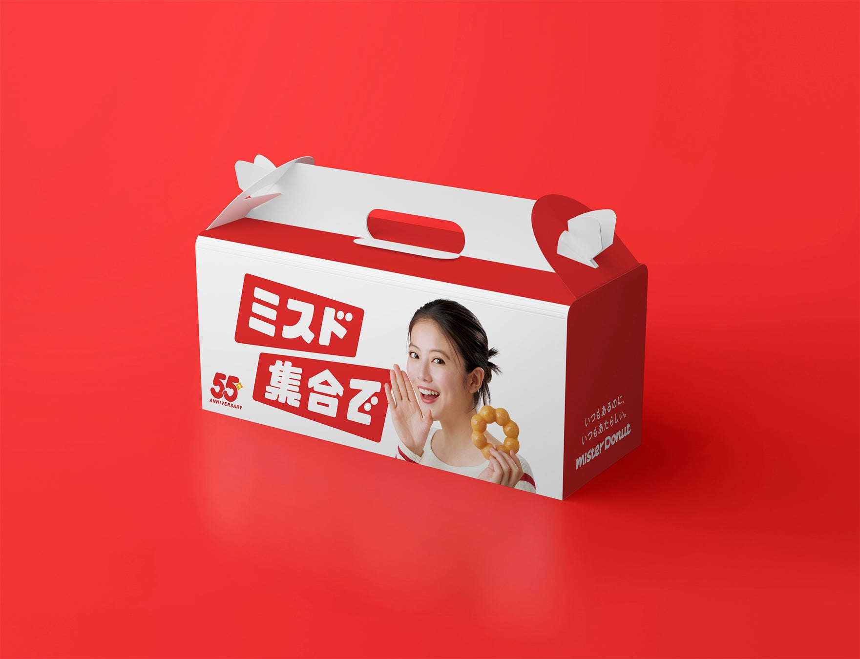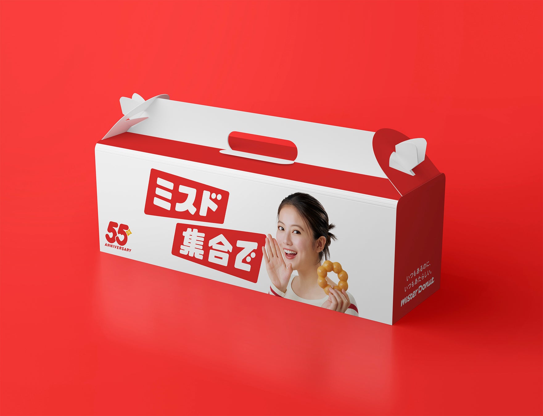 この度ご用意しますテイクアウトボックスには、新ブランドアンバサダーとして、TVCMにご出演いただく今田美桜さんが「ミスド集合で」と呼びかけている様子を表現した特別なボックスです。
