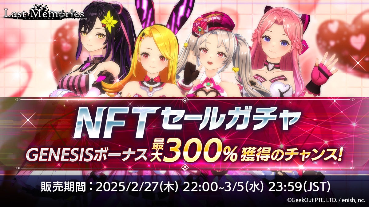 株式会社enish(本社:東京都港区、代表取締役社長:安徳孝平、以下enish)は、「GEEKOUT PTE. LTD.(本社:シンガポール、代表取締役:嶋瀬 宏)」と連携し、開発・運営中のブロックチェーンゲーム『De:Lithe Last Memories(ディライズ ラストメモリーズ)』のNFTドールガチャセールを2月27日(木)より開始します。本セールでは、一定数以上の購入で「NFT着せ替えドール」を貰えるキャンペーンも同時開催いたします。