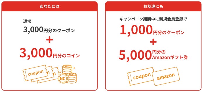 お友達にネイティブキャンプをご紹介いただくと、紹介者様には通常3,000円分のクーポンに加え、3,000円分のコイン(1,500コイン)をプレゼント。さらに、お友達も5,000円分のAmazonギフト券と1,000円分のクーポンがもらえます!