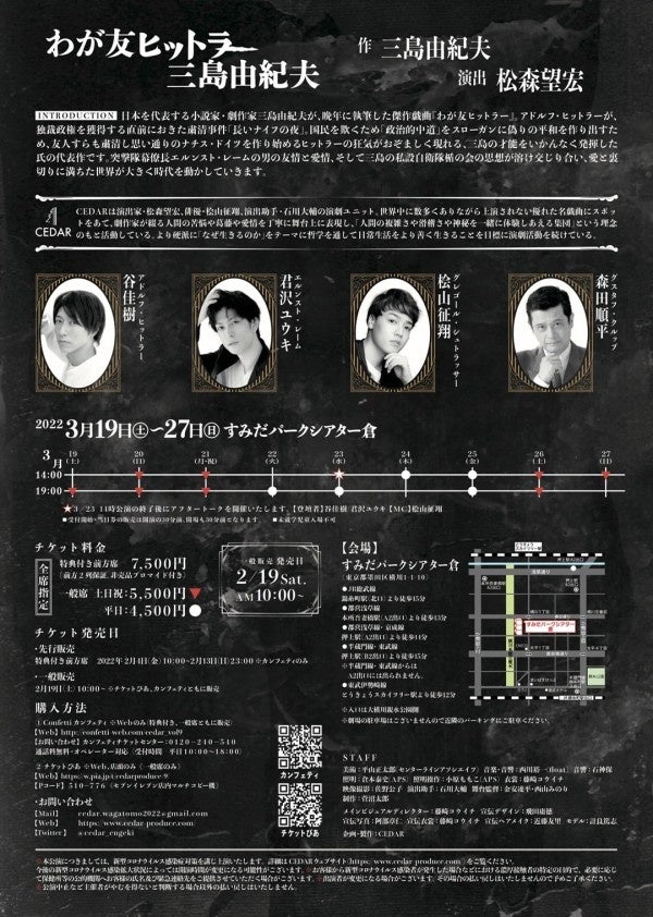 三島由紀夫晩年の戯曲 CEDAR Produce vol.9『わが友ヒットラー』上演間近 カンフェティでチケット発売