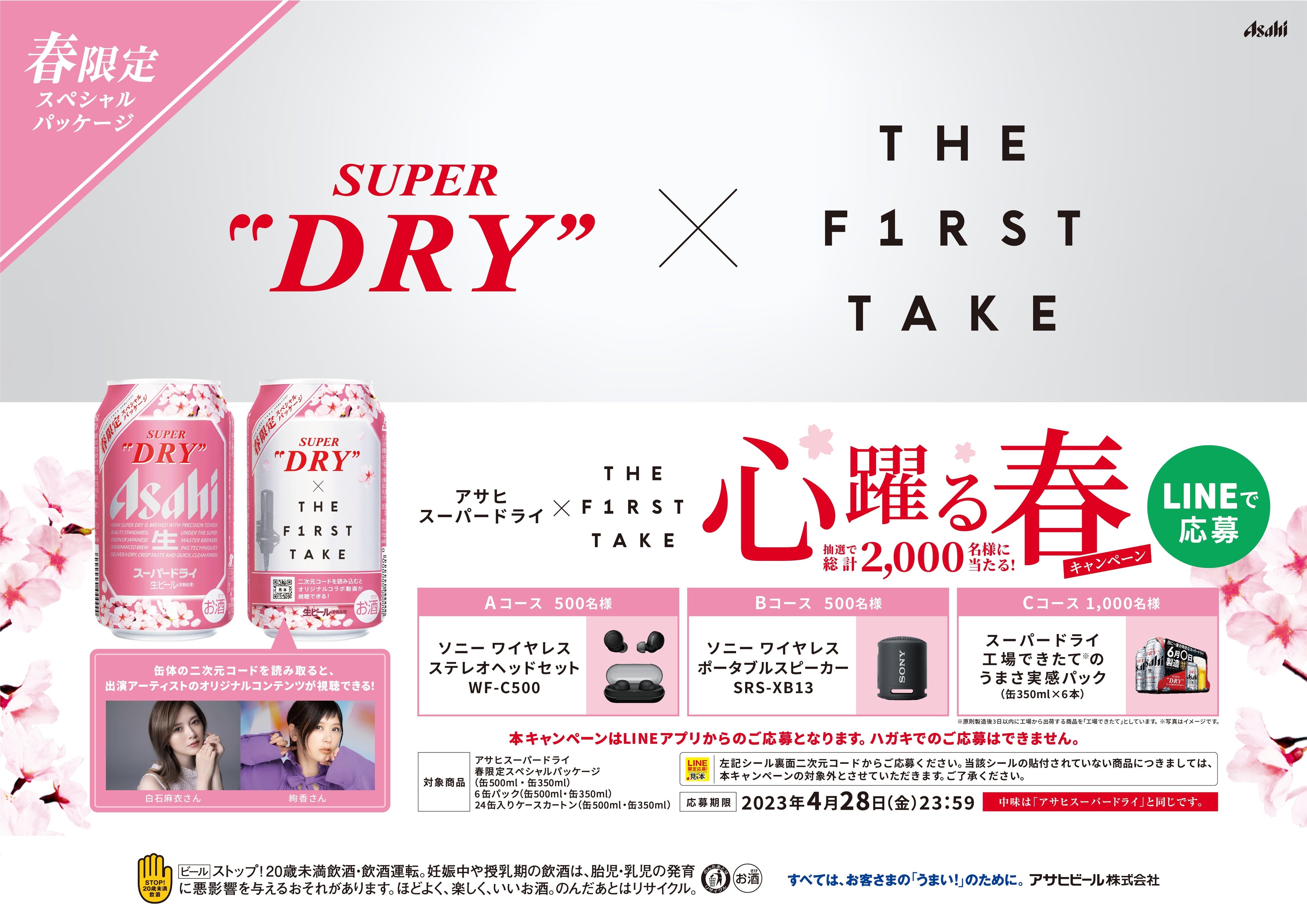 本商品の6缶パックやカートンを対象に、抽選で総計2,000名様に「ソニー ワイヤレスステレオヘッドセット WF-C500」などが当たる「アサヒスーパードライ×THE FIRST TAKE 心躍る春キャンペーン」も実施します。