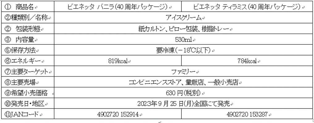 2023年9月に40歳の誕生日を迎えるビエネッタが華やかにドレスアップした「40周年パッケージ」にて、9月25日(月)より数量限定で発売いたします。
