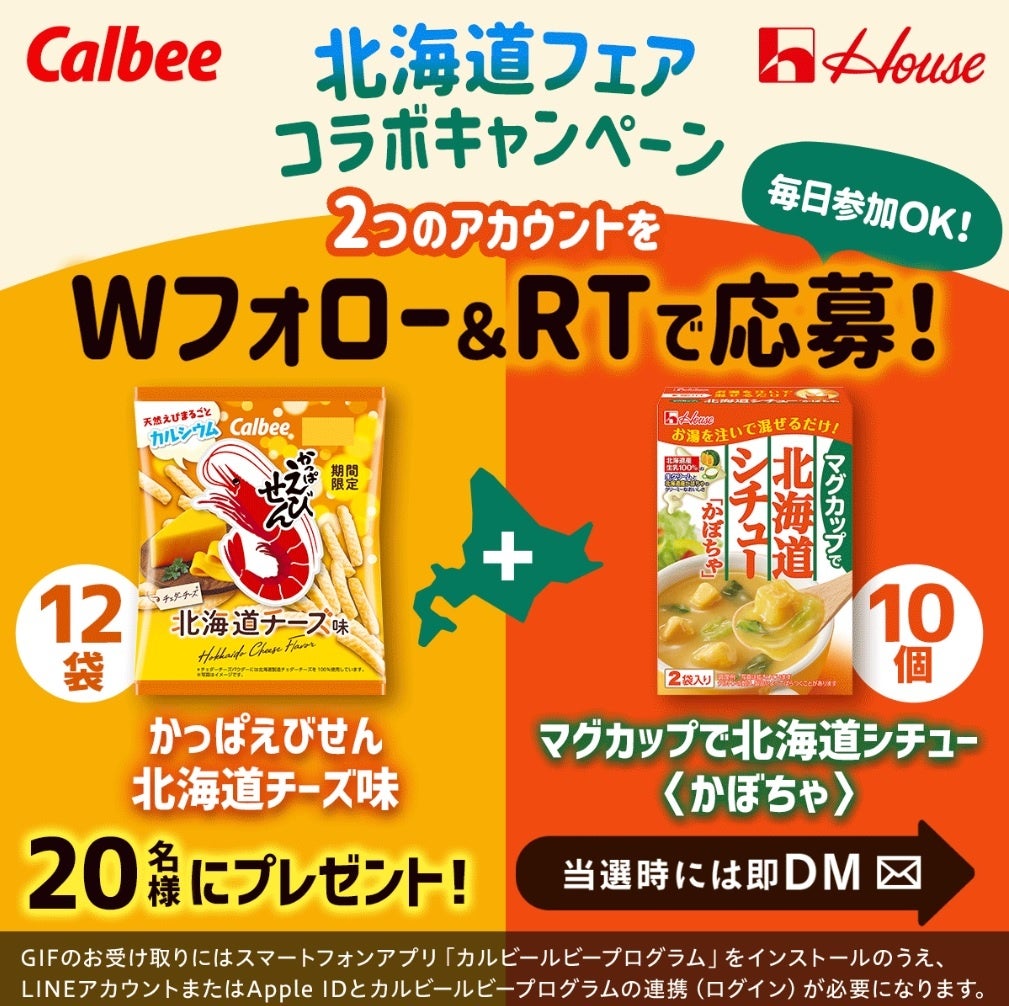 2つのアカウントをWフォローしリツイートすることで抽選で「かっぱえびせん 北海道チーズ」12袋入りとハウス食品「マグカップで北海道シチュー<かぼちゃ>」10個入りがセットで当たるインスタントウィンキャンペーンを実施します。