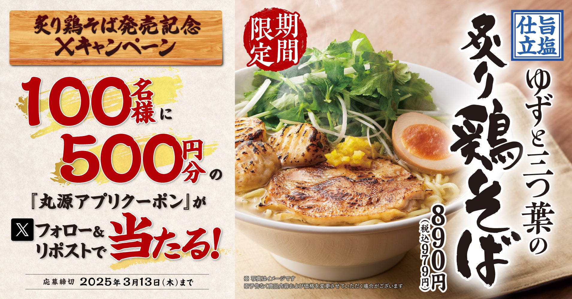 株式会社物語コーポレーション(本社:愛知県豊橋市/代表取締役社長:加藤 央之)が運営する『丸源ラーメン』は、「旨塩仕立 ゆずと三つ葉の炙り鶏そば」の発売を記念して、2025年3月6日(木)より、抽選で100名様に「500円分の丸源ラーメンのアプリクーポン」が当たる、Xフォロー&リポストキャンペーンを開催いたします。
