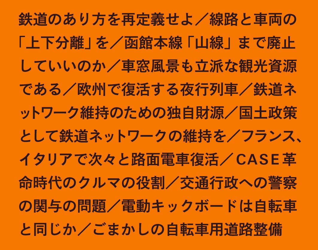本書では、鉄道ネットワークの寸断、路面電車の導入が進まない現状、CASE時代の自動車の再定義の必要性、「歩道のカオス化」など、日本の交通政策の現状をトータルに概観し、「総合的な交通政策」の必要性を提言しています。交通政策や都市政策に興味を持つ方、鉄道ファンなどには、強くお勧めできる本かと思います。