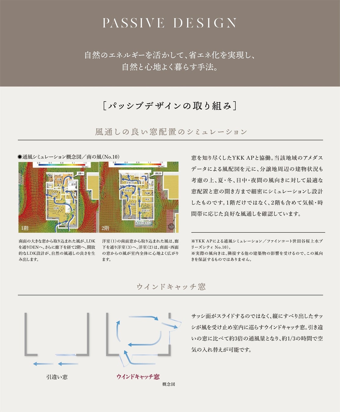 「ウィンドキャッチ窓」とは、YKK AP株式会社のシミュレーションシステムを活用し、本物件周辺の風向・風速や建物配置を詳細に検証し、夏・冬および日中・夜間といった条件に合わせた最適な窓の開き方を設定したものです。