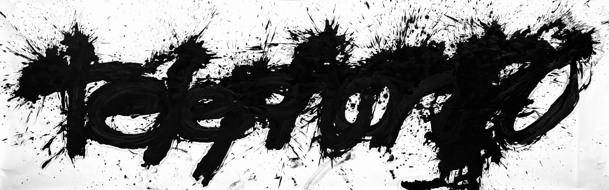 本展では、「文字」がうまれる前の、かつて情報の伝達に使われていた「記号」や、言葉の起源を探ろうと試みた作品群を展示します。メインビジュアル「telephonix」(テレフォニックス)は、「空気を伝う音声が文字として視覚的な形を持ち、遥かな時空を流転して読まれることで再び音声として蘇ることの不思議さ」から着想した造語。それをまるで黒い文字の生き物が飛び出すかのようにタオルで大胆に描いた大作です。アルファベット一字一字が生き物であり、文字の生態は、それらが結びつくことで成り立っていると考えるハシグチの世界観がその筆跡から見出されます。
