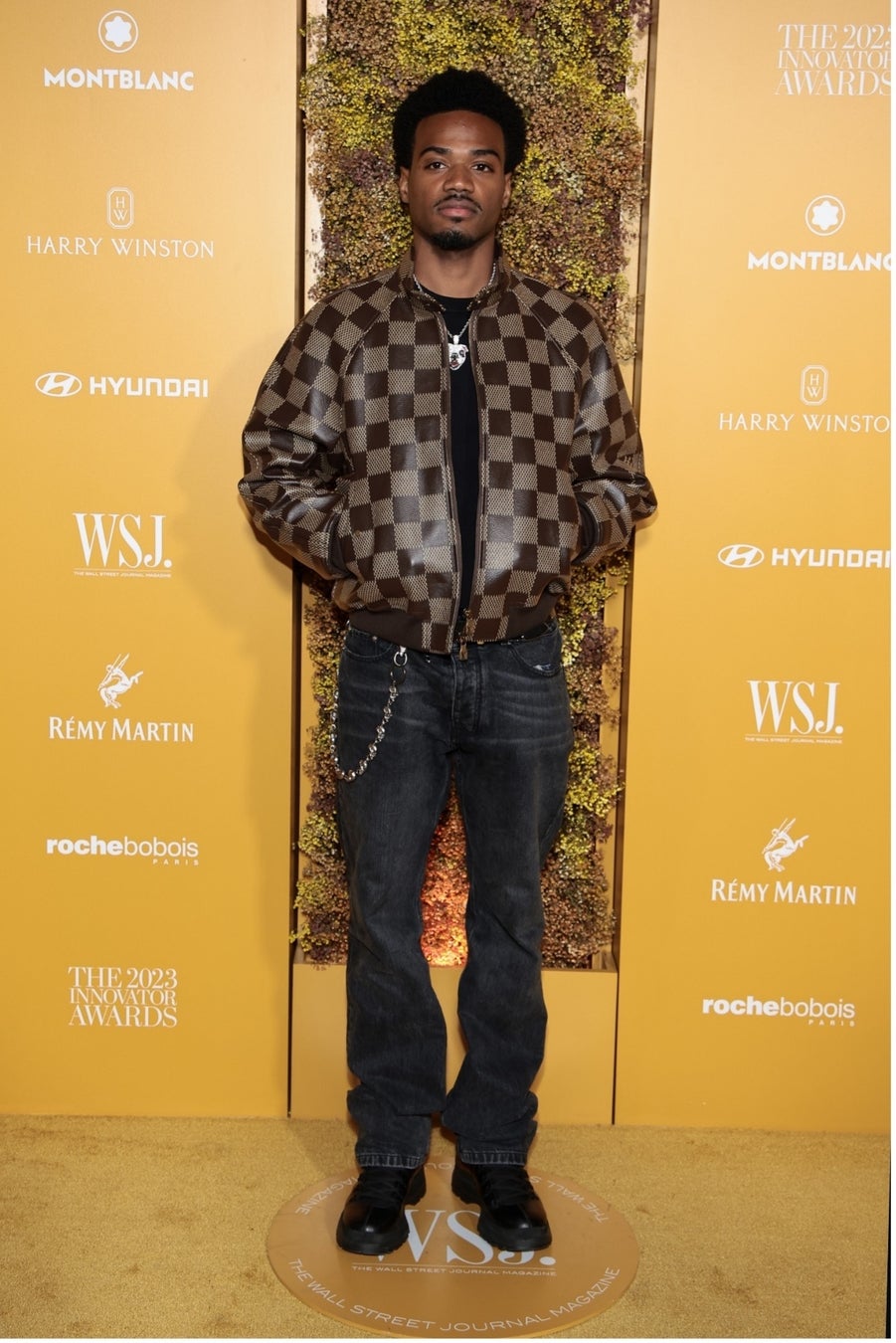 タイショーン·ジョーンズは、2024年春夏コレクションのブラウンのダミエ·レザージャケットを着用しました。