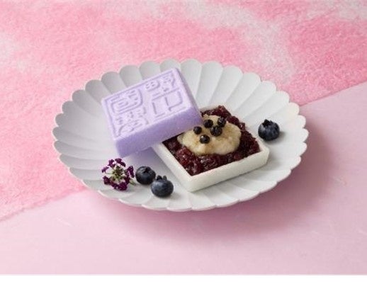 ラベンダーの花の香りをとじこめたブルーベリー餡と、ウィステリア(藤)ハニー入りのクリームチーズ餡をあわせた最中。
