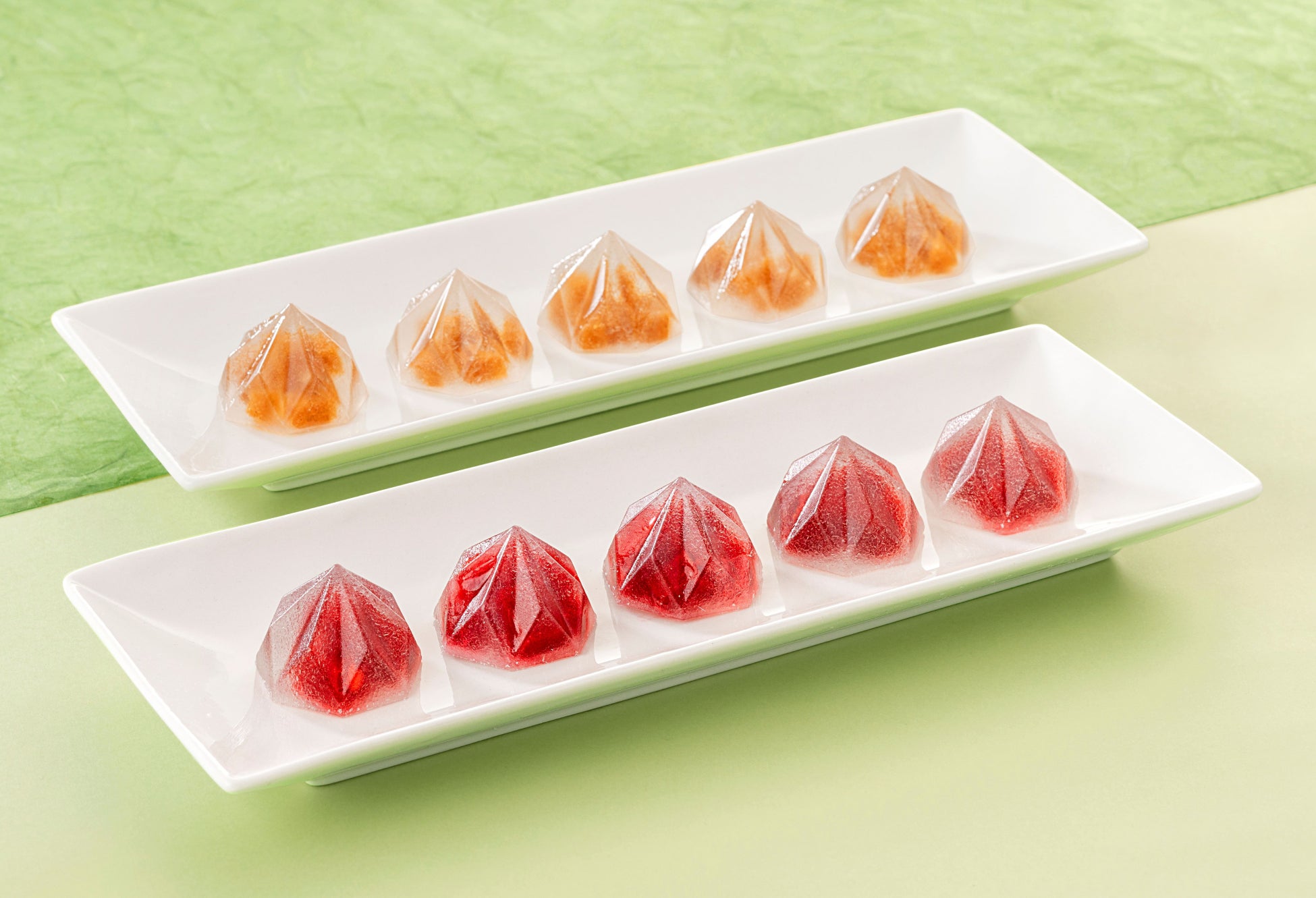 ローズヒップ寒天に自家製エルダーフラワーシロップ、白あずき餡、お餅をあわせました。
